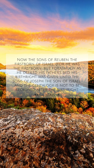 Now the sons of Reuben the firstborn of Israel, (for he was the firstborn; but forasmuch as he defiled his father's bed, his birthright was given unto the sons of Joseph the son of Israel: and the genealogy is not to be reckoned after the birthright.