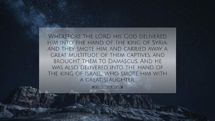 Wherefore the LORD his God delivered him into the hand of the king of Syria; and they smote him, and carried away a great multitude of them captives, and brought them to Damascus. And he was also delivered into the hand of the king of Israel, who smote him with a great slaughter.