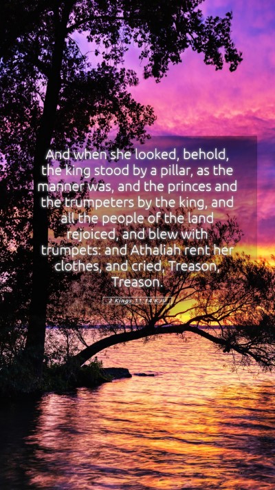 And when she looked, behold, the king stood by a pillar, as the manner was, and the princes and the trumpeters by the king, and all the people of the land rejoiced, and blew with trumpets: and Athaliah rent her clothes, and cried, Treason, Treason.