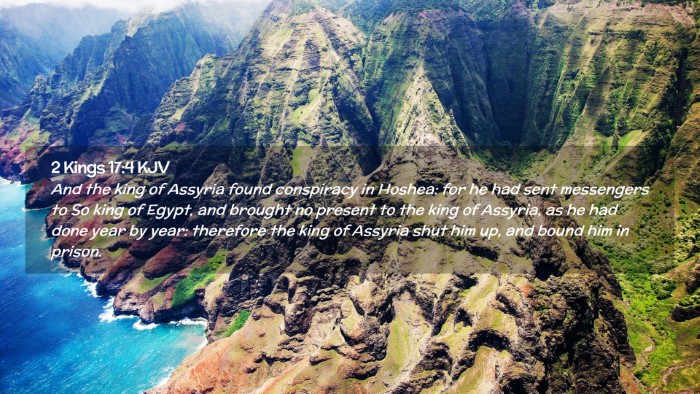 And the king of Assyria found conspiracy in Hoshea: for he had sent messengers to So king of Egypt, and brought no present to the king of Assyria, as he had done year by year: therefore the king of Assyria shut him up, and bound him in prison.
