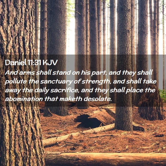 And arms shall stand on his part, and they shall pollute the sanctuary of strength, and shall take away the daily sacrifice, and they shall place the abomination that maketh desolate.