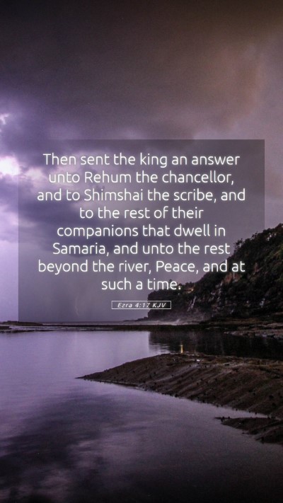Then sent the king an answer unto Rehum the chancellor, and to Shimshai the scribe, and to the rest of their companions that dwell in Samaria, and unto the rest beyond the river, Peace, and at such a time.