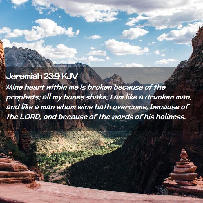Mine heart within me is broken because of the prophets; all my bones shake; I am like a drunken man, and like a man whom wine hath overcome, because of the LORD, and because of the words of his holiness.
