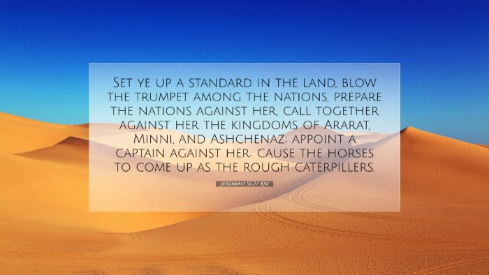 Set ye up a standard in the land, blow the trumpet among the nations, prepare the nations against her, call together against her the kingdoms of Ararat, Minni, and Ashchenaz; appoint a captain against her; cause the horses to come up as the rough caterpillers.