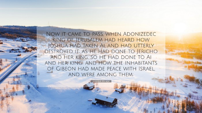 Now it came to pass, when Adonizedec king of Jerusalem had heard how Joshua had taken Ai, and had utterly destroyed it; as he had done to Jericho and her king, so he had done to Ai and her king; and how the inhabitants of Gibeon had made peace with Israel, and were among them;