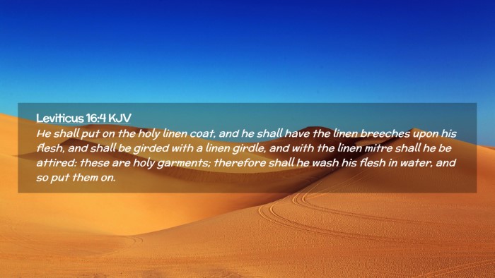 He shall put on the holy linen coat, and he shall have the linen breeches upon his flesh, and shall be girded with a linen girdle, and with the linen mitre shall he be attired: these are holy garments; therefore shall he wash his flesh in water, and so put them on.