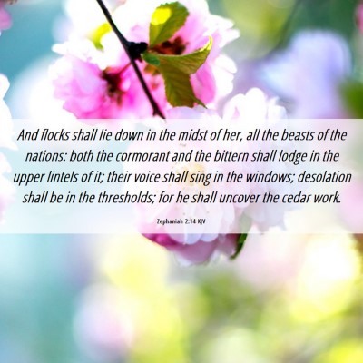 And flocks shall lie down in the midst of her, all the beasts of the nations: both the cormorant and the bittern shall lodge in the upper lintels of it; their voice shall sing in the windows; desolation shall be in the thresholds; for he shall uncover the cedar work.